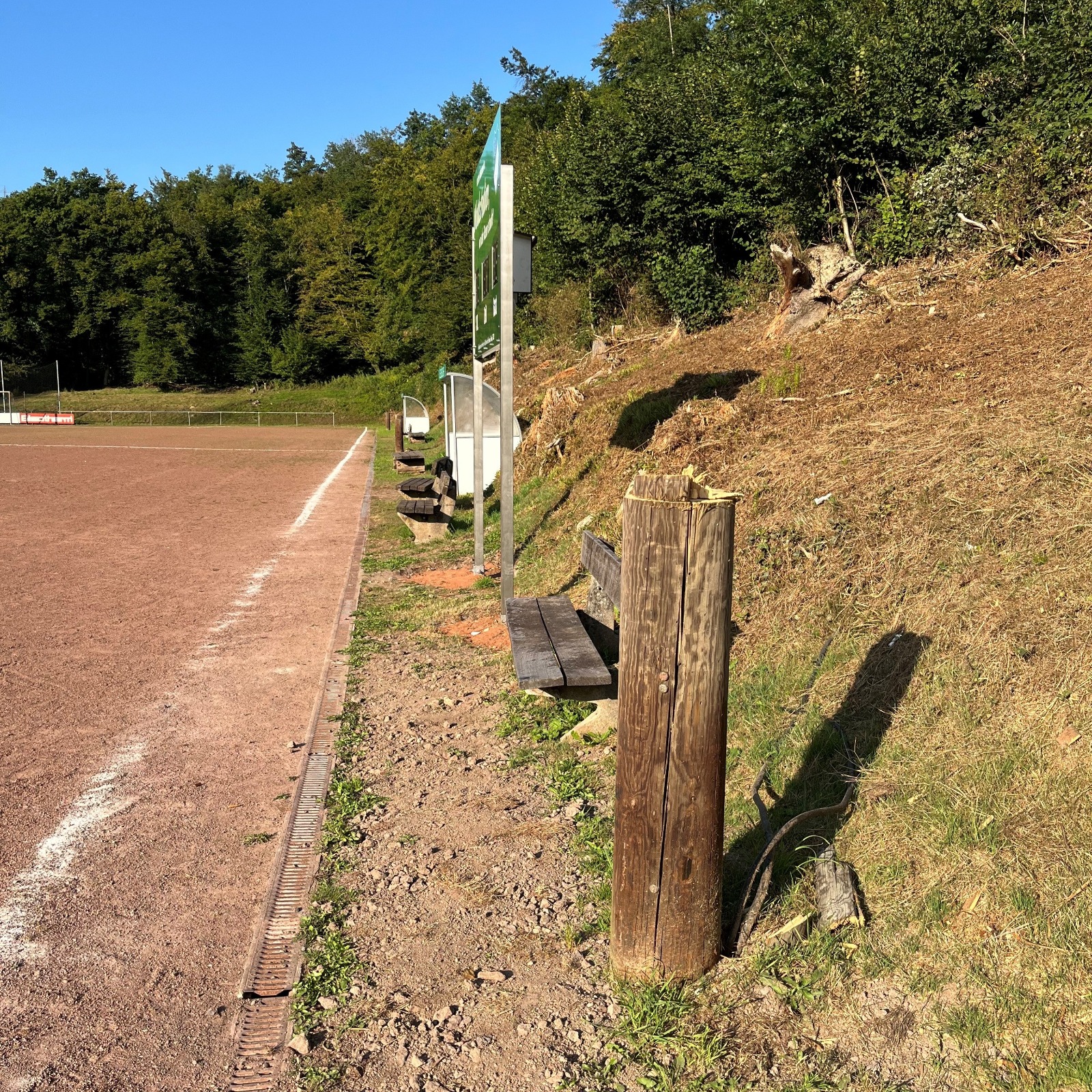 Die 3 Flutlichtmasten aus Holz mussten aus behördlichen Gründen entfernt werden. Durch Spechtlöcher und Feuchtigkeit sind die Holzmasten über Jahre hinweg sehr beschädigt worden.