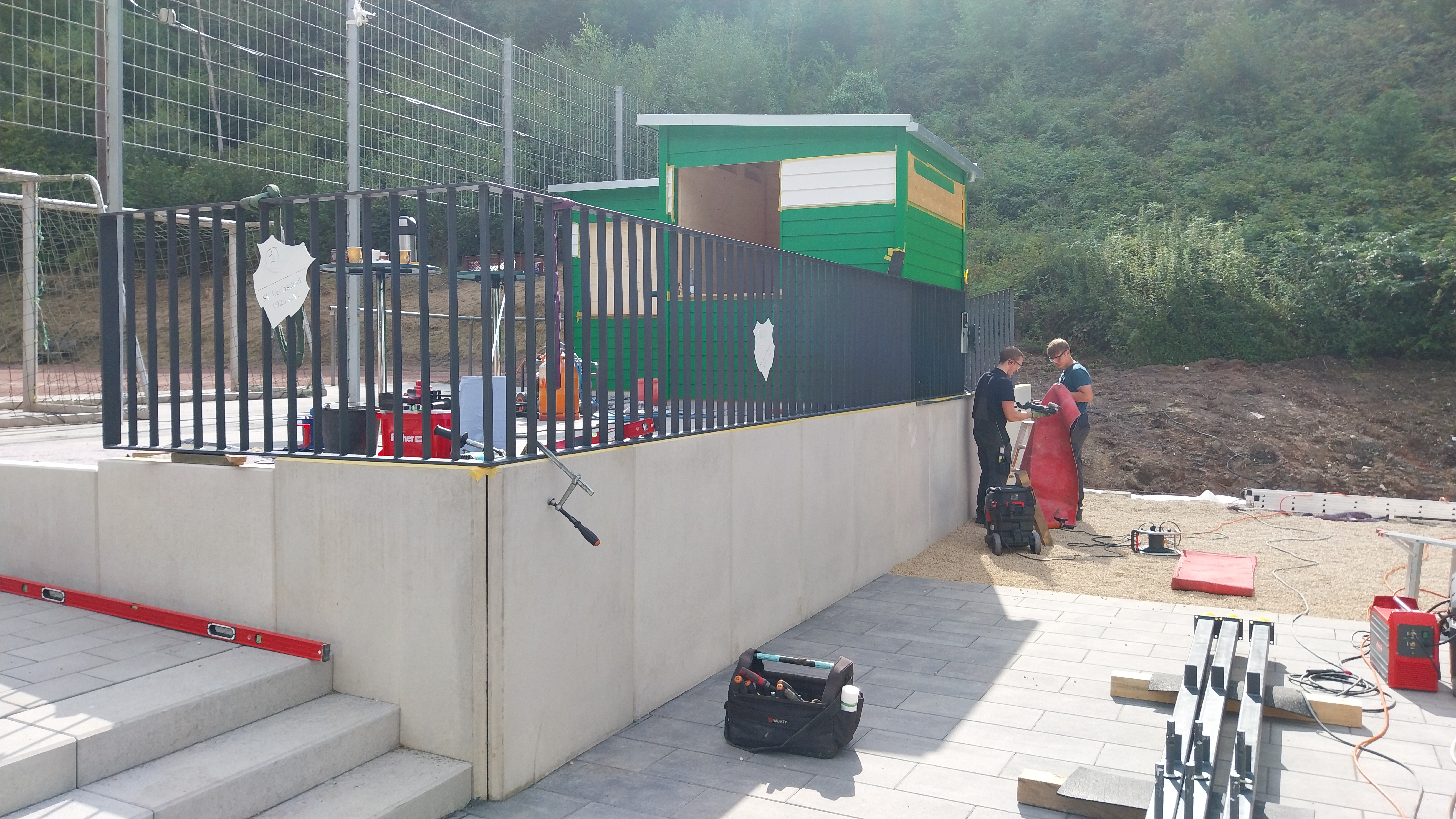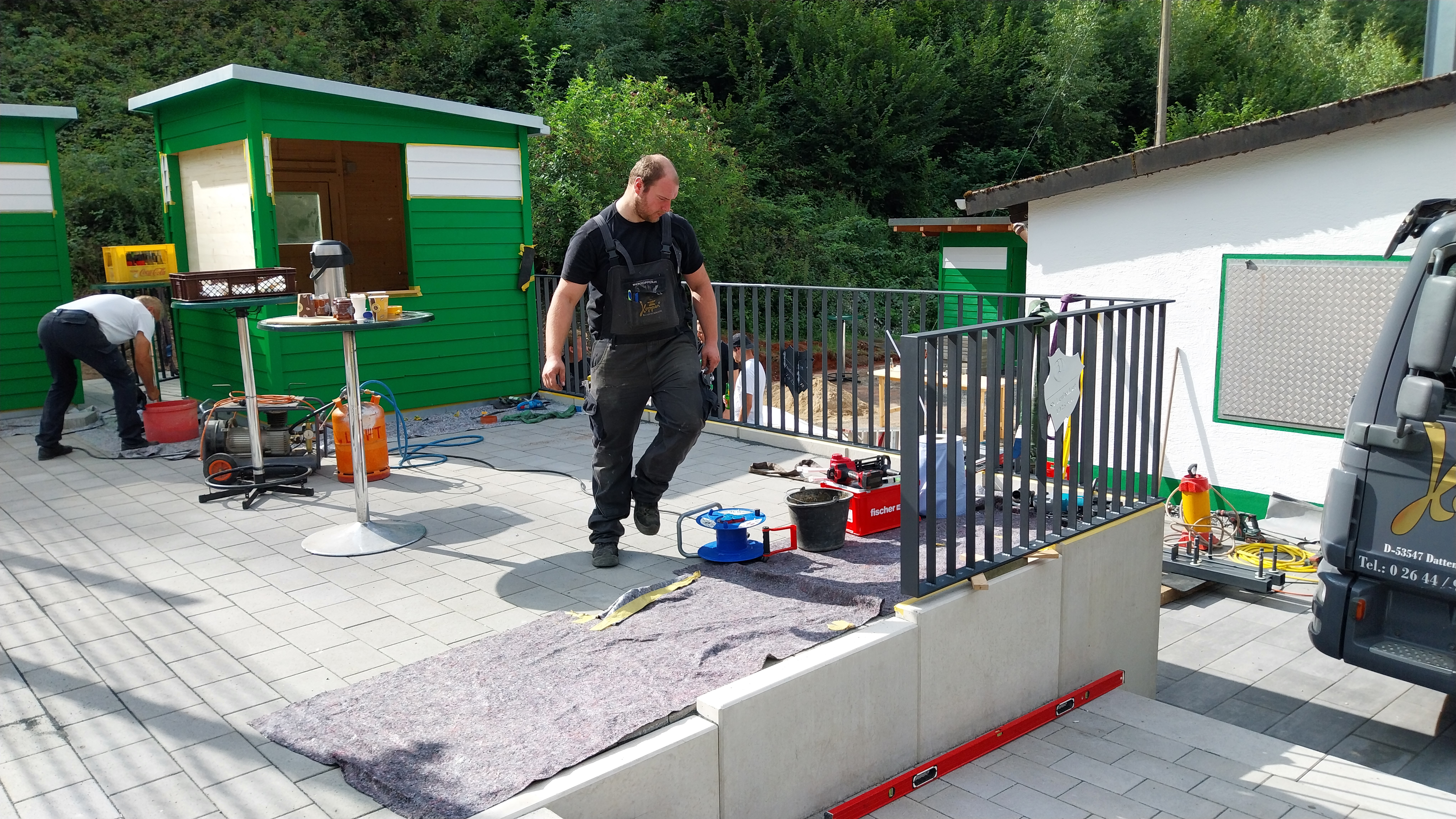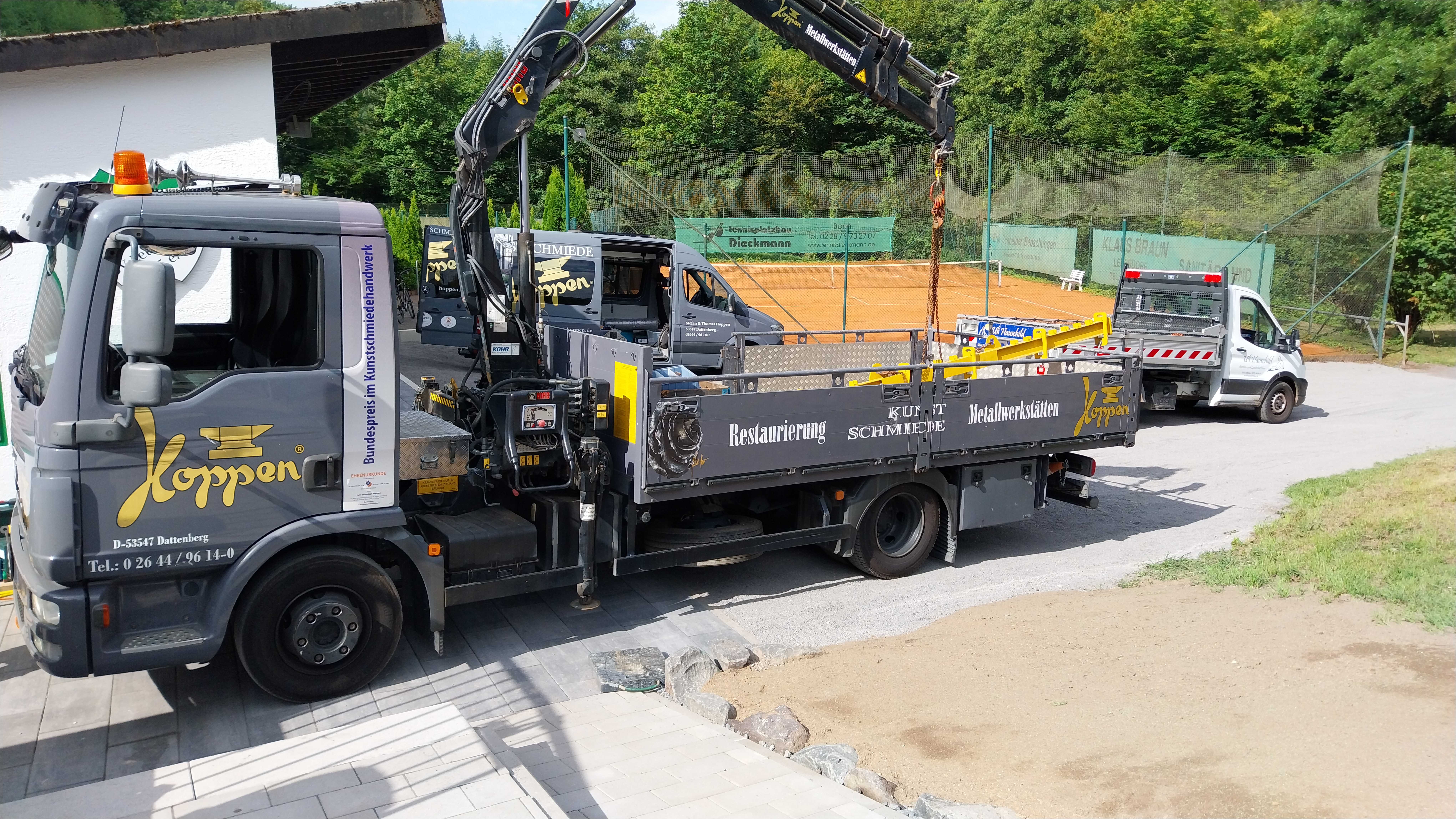 Die Kunstschmiede Hoppen rückt mit ihrem LKW an, um das Geländer für die Fanterrasse zu montieren.