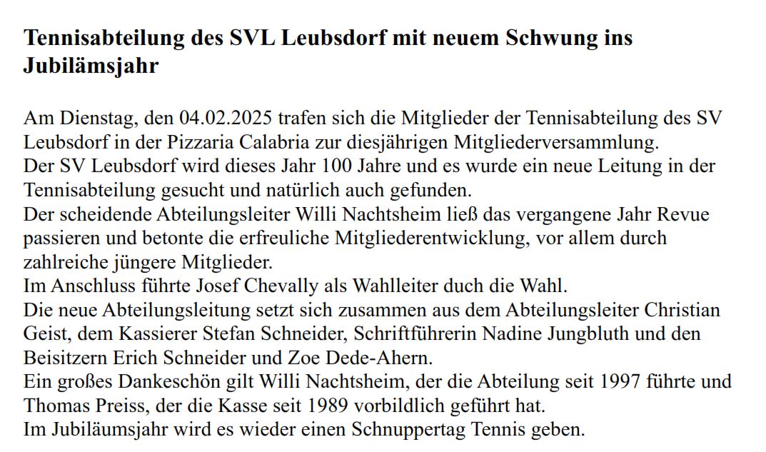TC Leubsdorf schließt sich dem SV Leubsdorf e.V. als weitere Fachabteilung an. Änderung der Vereinssatzung wird erforderlich.